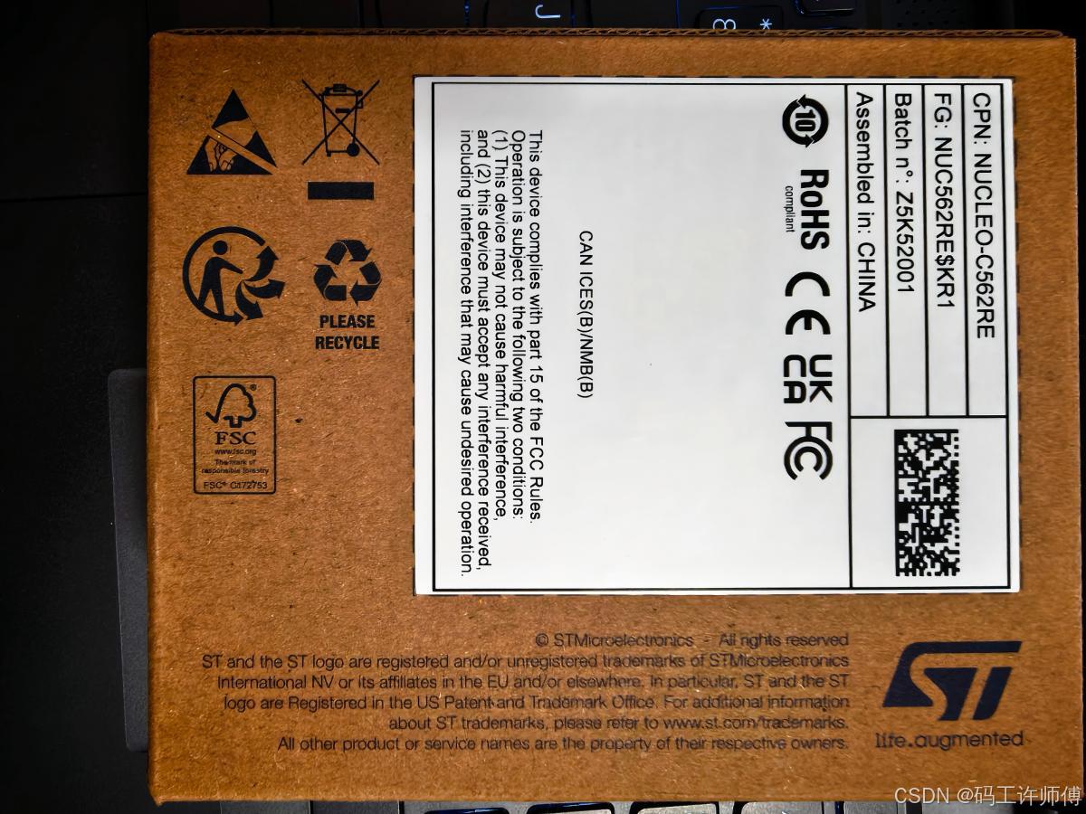 3月12日在得捷电子买的NUCLEO-C562RE开发板,从美国明尼苏达州发货,经过两个多星期的等待,上周末终于收到货了。经典的NUCLEO-64环保纸盒: