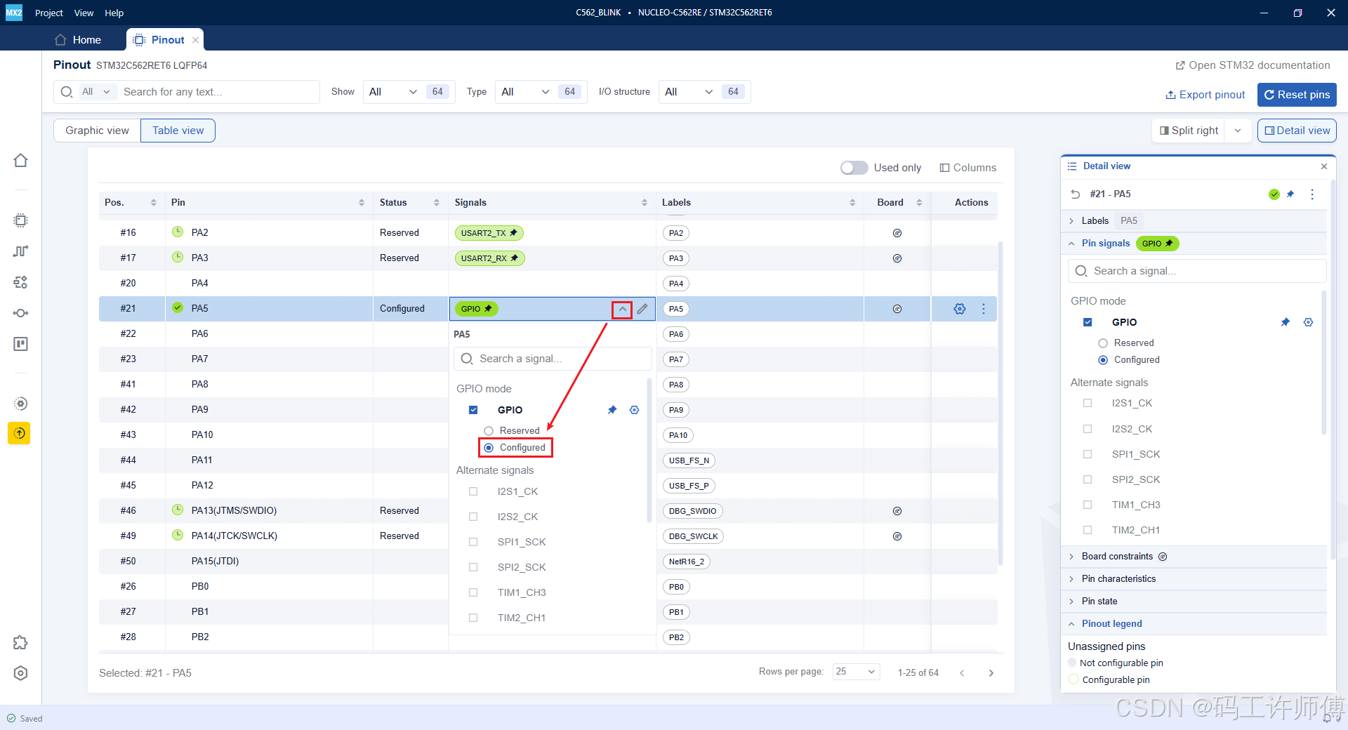 找到PA5,展开Signals列的下拉菜单,勾选Configured: