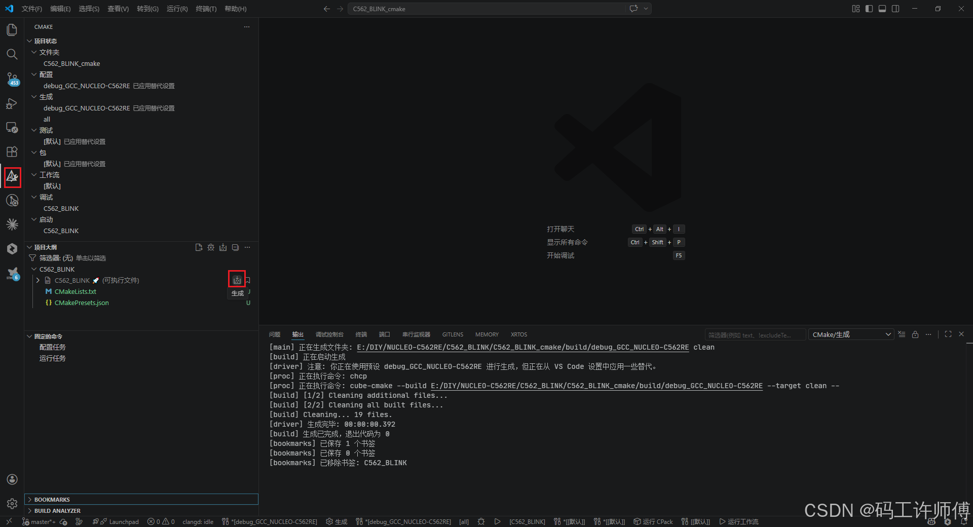 点左侧CMake工具,然后找到C562_BLINK目标右侧的生成图标: