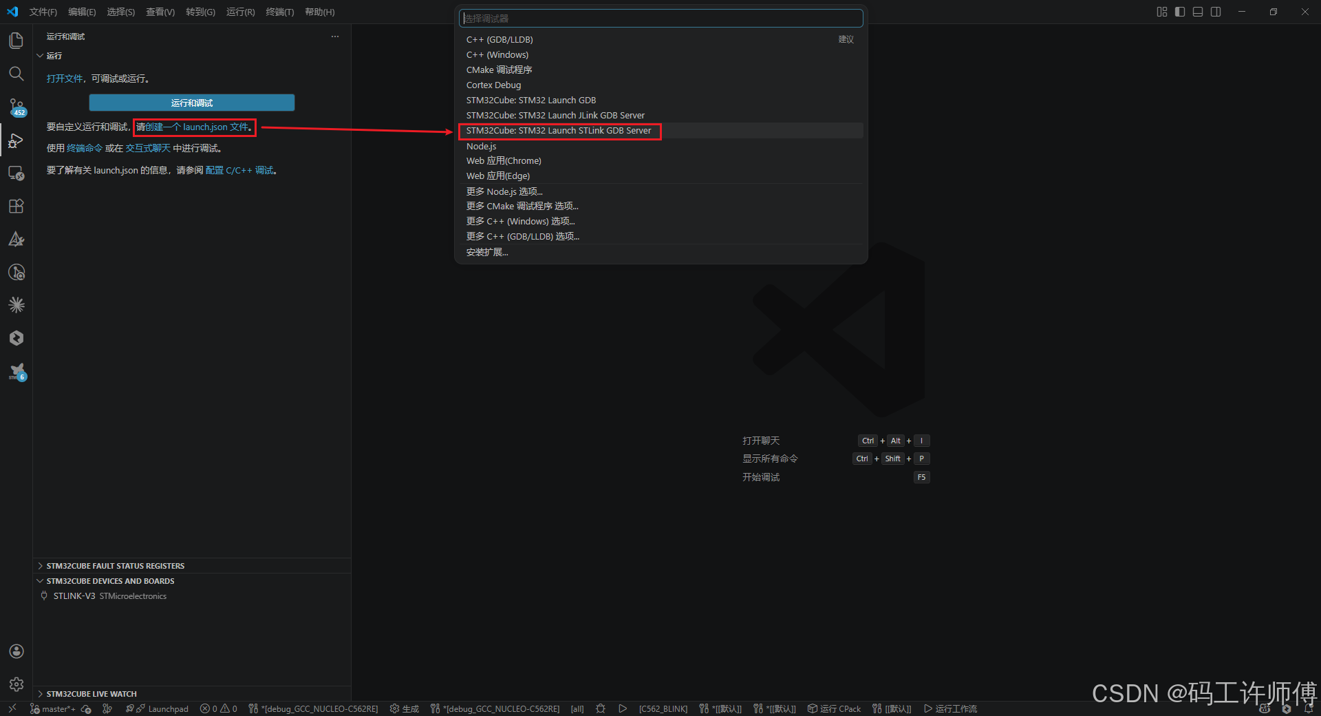 项目默认没有调试的配置文件,需要点"创建一个launch.json文件",然后选中STLink GDB Server选项: