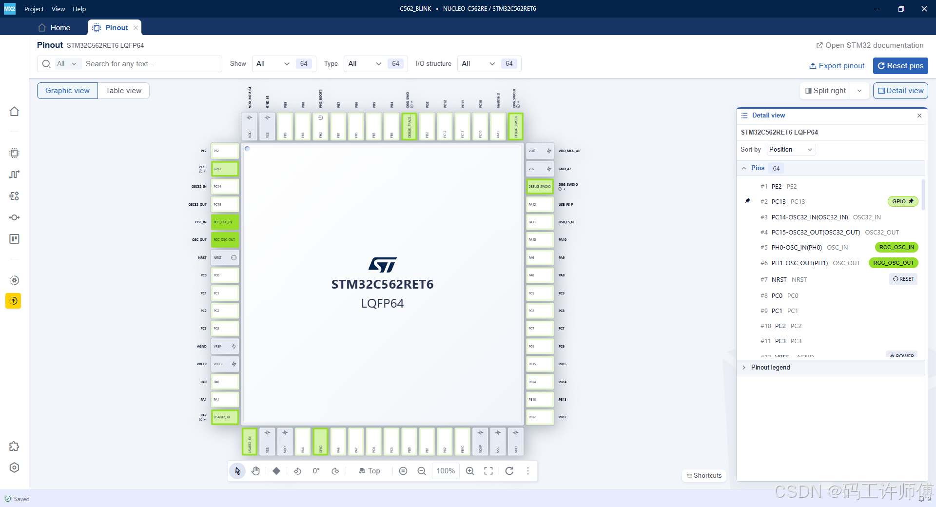 刚进入配置界面是Pinout标签页,默认是图形化视图(Graphic view):