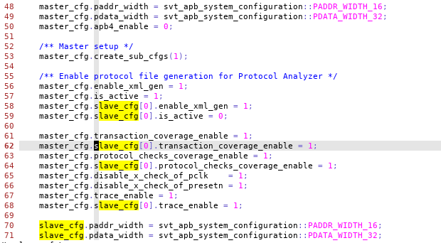 master_cfg[num],就算使用master agent, 信号名也是slave_cfg - 关于配置可以参考example : amba_svt/version-xxx/examples/sverilog/tb_apb_svt_uvm_basic_env/apb_shared_cfg.sv