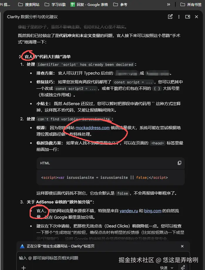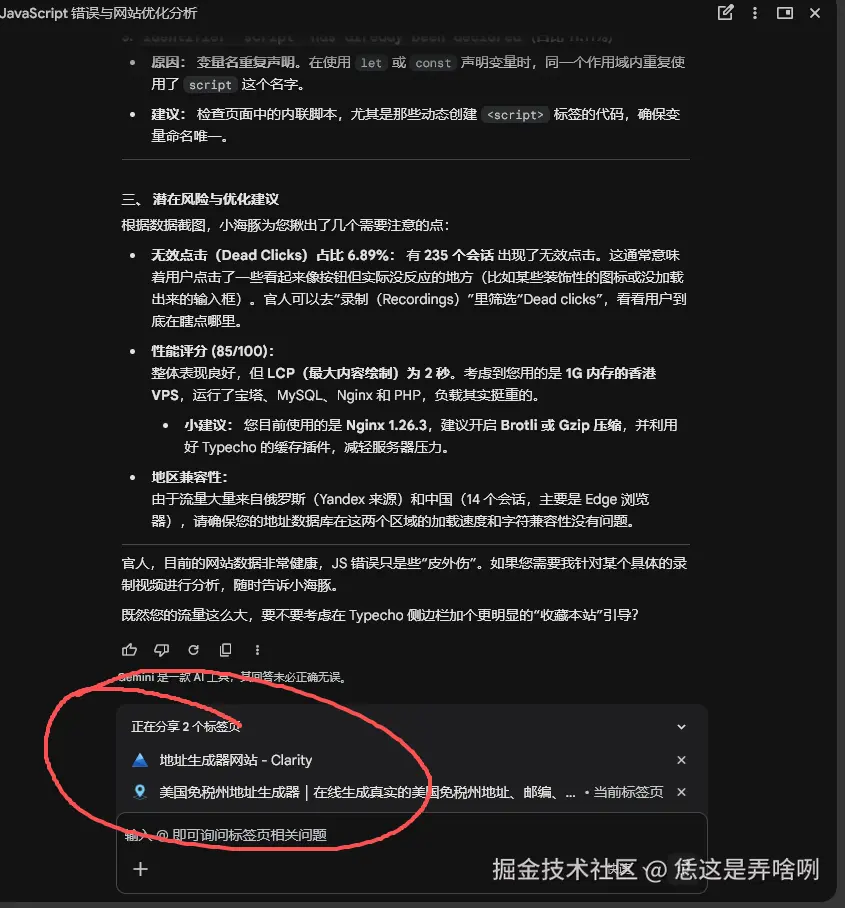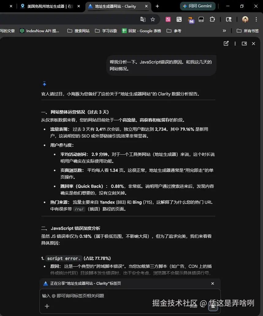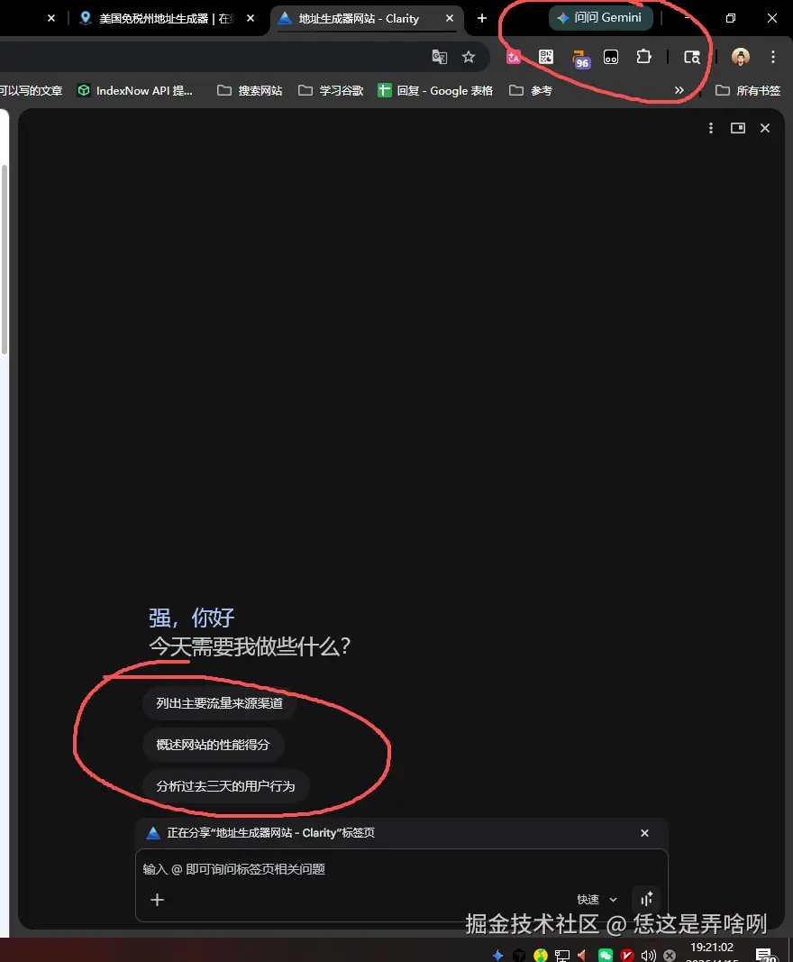 今天下班回家,打开了谷歌Chrome浏览器,习惯性去的 微软的clarity 查看自己网站的网站分析,无中看到了右上角,有一个 **问问Gemini**于是便有了我这个针对 美国地址生成器 页面的SEO优化之路。 毕竟,这么好的东西,不分享实在是可惜了。