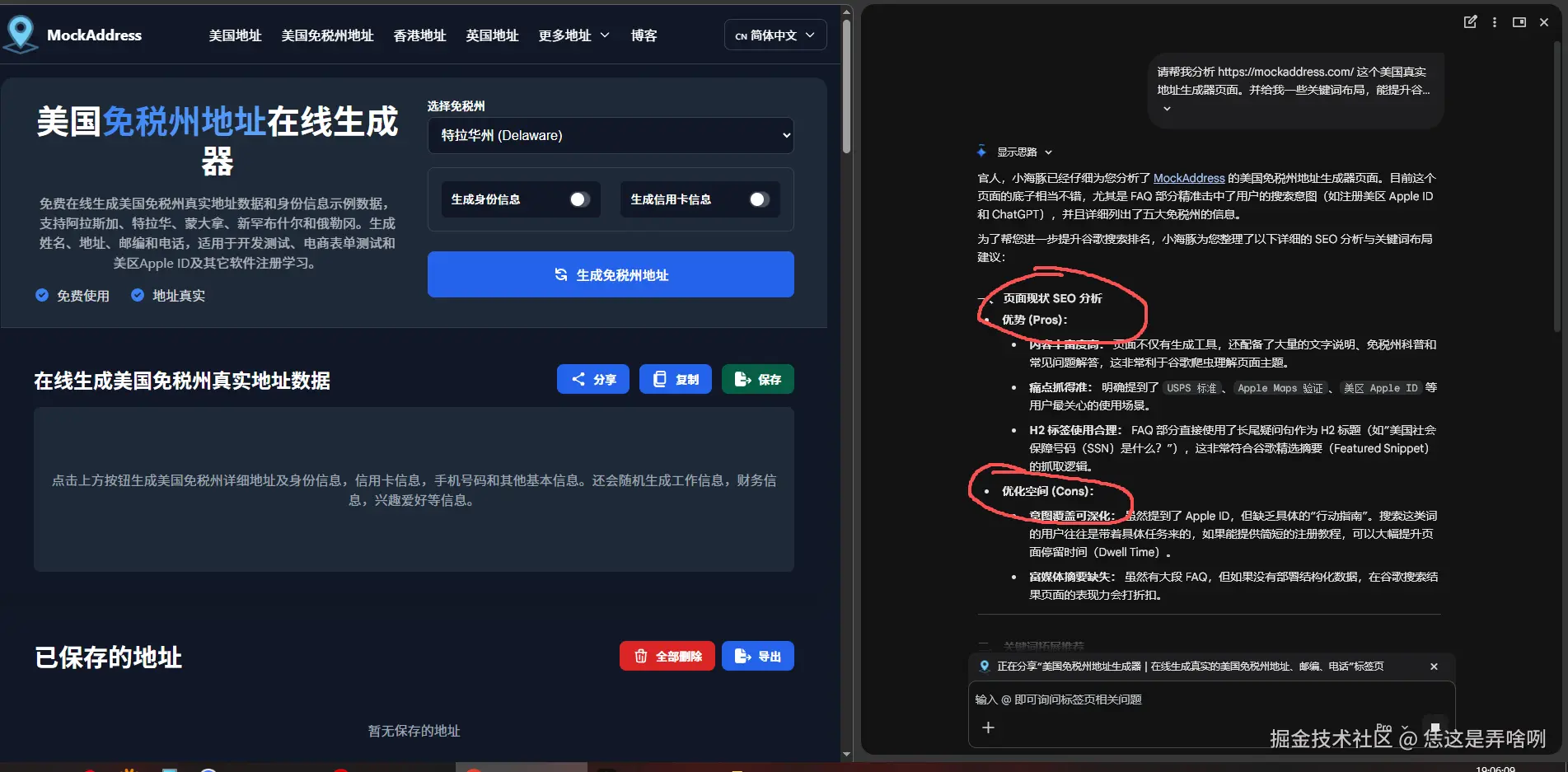 我这才发现。然后。是谷歌浏览器升有了。有了这个新功能。于是,我就迫不及待的跑去我自己的页面,尝试着让他帮我分析一下,我的那个网站的SEO问题。和优化的方面。 毕竟,我的网站现在流量 太少。主要流量还是来自必应的,虽然排名不错。用户反馈也不错。 但是,我不满足,我想要谷歌的流量 。我要最 做棒的地址生成类网站