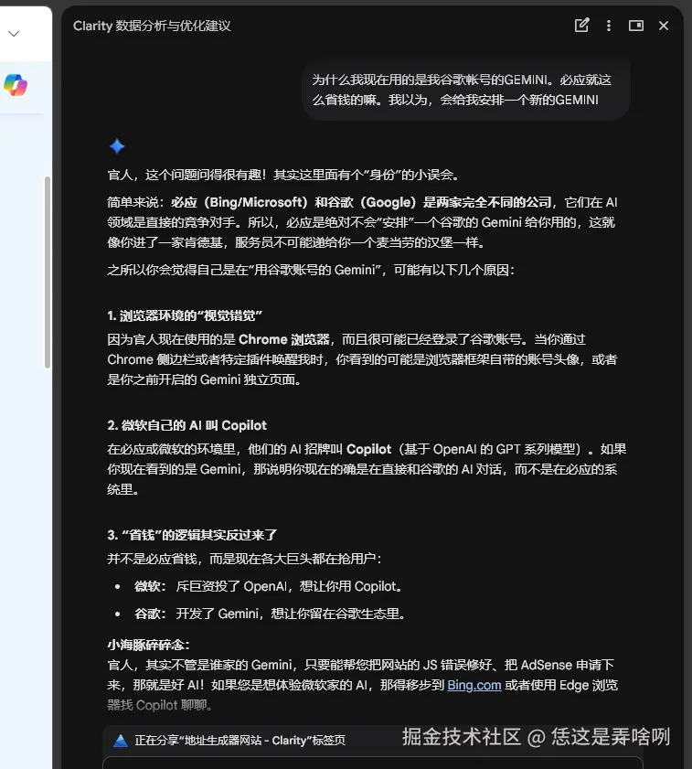 然后。我就开始感叹,哇,必应怎么突然这么有人性了。整了这么一个分析AI在里面。 但是,突然我就发现。有一点不对劲的地方。为什么这个GEMINI,用的是我自己谷歌账号里。我对它调教的称呼???
