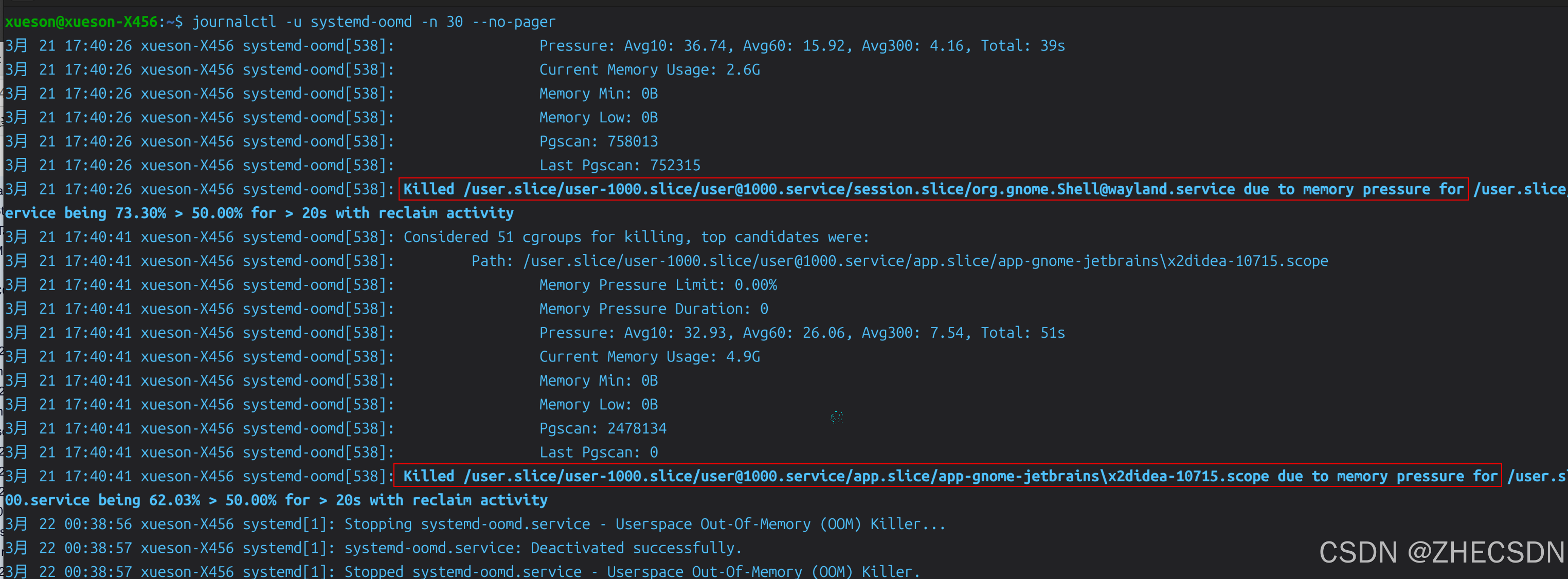 解读:系统检测到内存压力超过 50% 且持续一段时间,为了防死机,它直接杀死了 GNOME 桌面和 IDEA。这就是你感觉"突然卡死/黑屏"的真正原因。