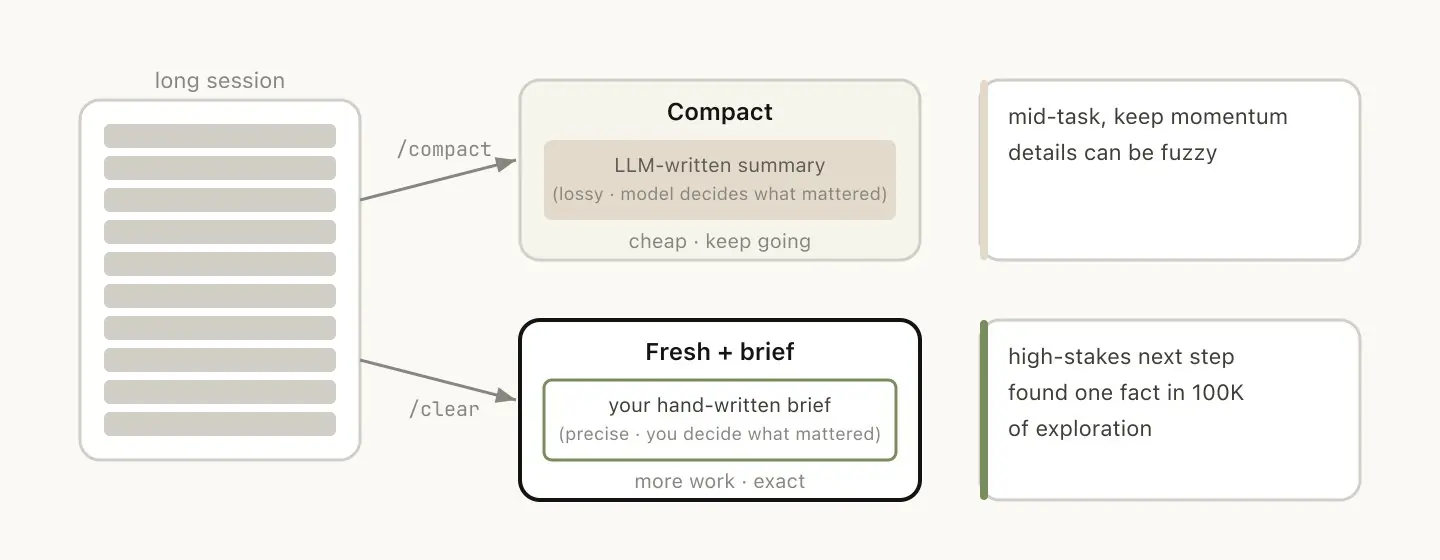 /clear:你手动写一段 brief,清空 session 重头开始。费力,但结果是你决定的上下文------「我们在重构 auth 中间件,约束是 X,关键文件是 A 和 B,已经排除了方案 Y」。