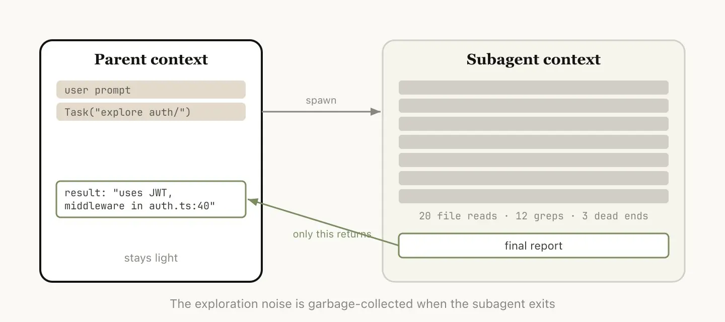 本质上是把「只需要结论、不需要过程」的工作隔离出去,保持主 session 的上下文质量。