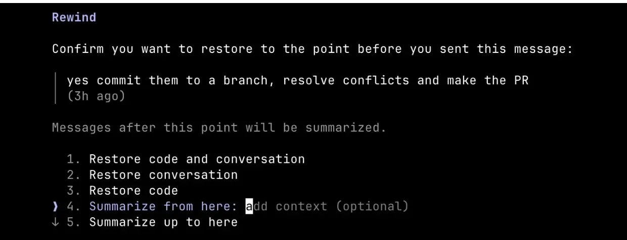 还有一个配合用法:先让 Claude「从这里总结一条交接消息」,把有用的信息提炼出来,复制好,然后再 esc esc 回到之前的节点,把那句总结粘贴进 prompt 重来。