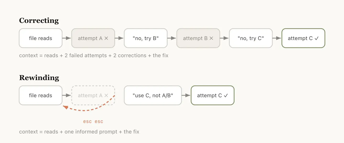 继续纠错会把「失败的尝试」全程保留在上下文里;rewind 把那段历史删掉,拿着干净的上下文重新出发。