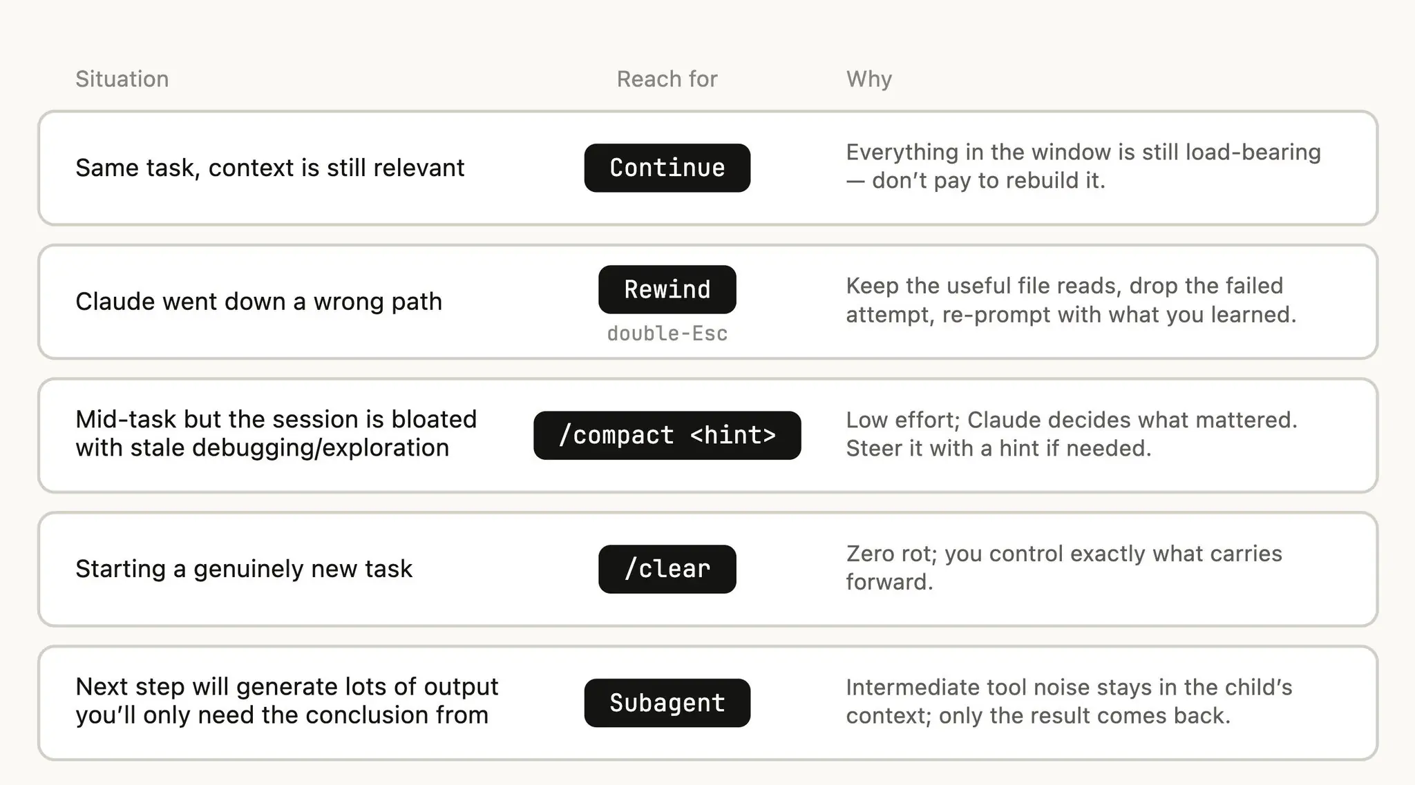 不同情境下怎么选,Thariq 做了一张决策表: