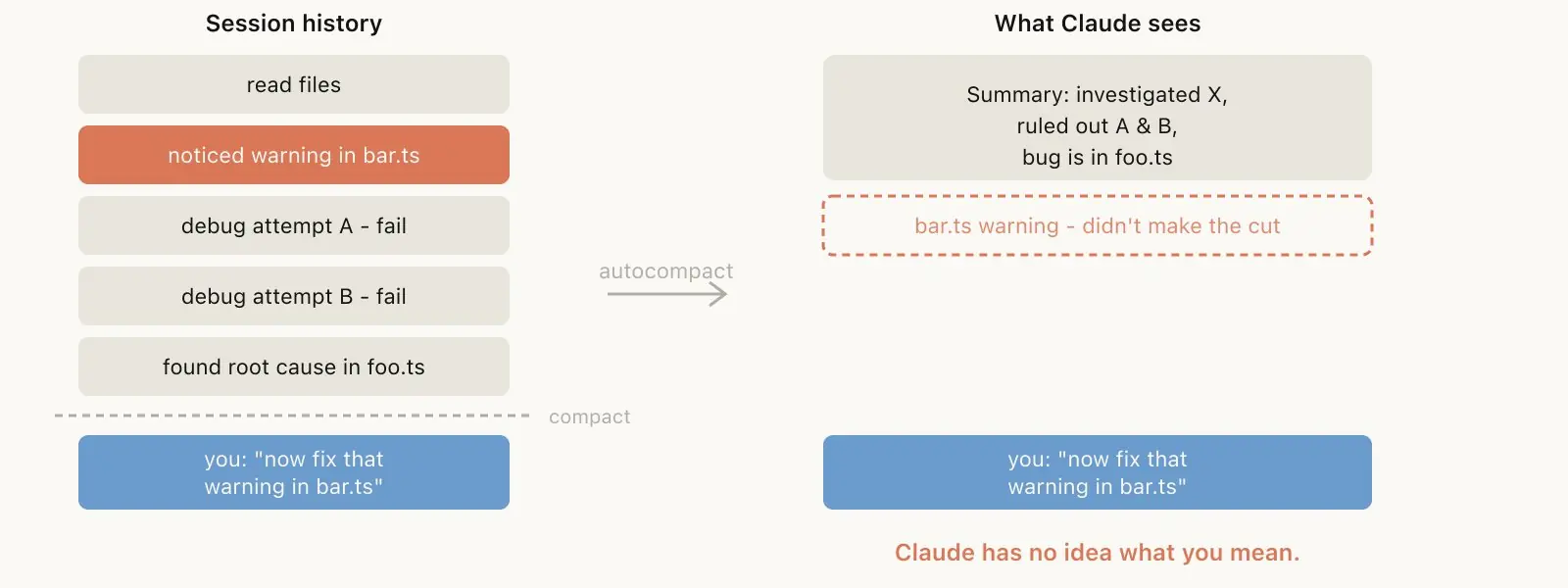 一个典型场景:长时间调试之后,autocompact 触发,把调试过程压缩了。但下一条消息是「去修一下 bar.ts 里的那个 warning」------因为 session 重心在调试,那个 warning 可能根本没进摘要。