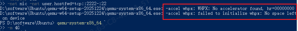 报错原因:WHPX 硬件加速不可用 / 初始化失败原因:你的 Windows 没开启 Hyper-V / 虚拟机平台,所以 -accel whpx 用不了。