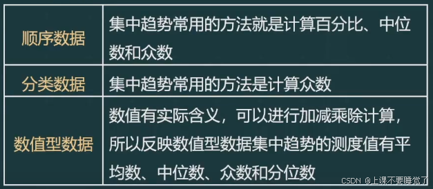 数据的集中趋势是指一组数据集中于某一中心的水平位置。测度集中趋势也是寻找数据一般水平的中心值或代表值。