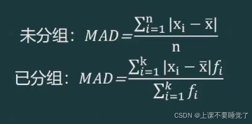 也称为平均绝对差,它利用了全部数据计算,因此容易受到极端值的影响,主要用于数值型数据,因其数学性质较差,不常使用。其计算公式为: