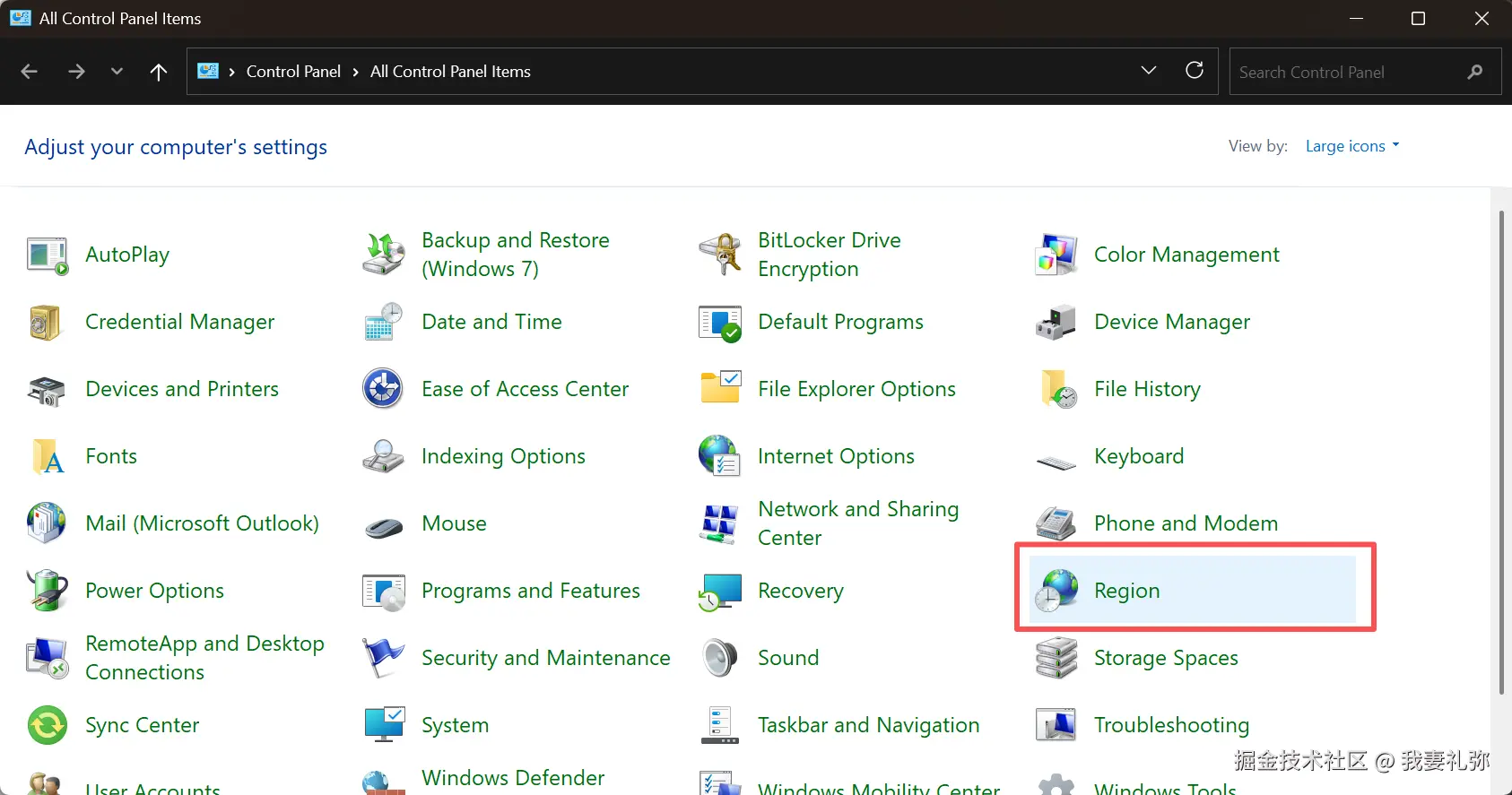 - 打开控制面板,选择区域
