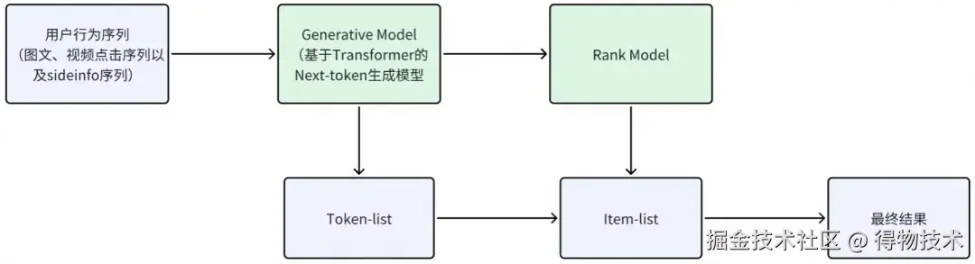 - Next-Token Prediction 范式:通过预测用户下一个可能点击的内容,实现端到端的用户兴趣融合建模。