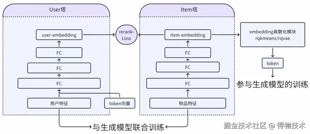 - 联合训练机制:通过召回目标同时训练 rerank 模型的 item 塔与 user 塔,与 Generative Model 共享底层特征表示;