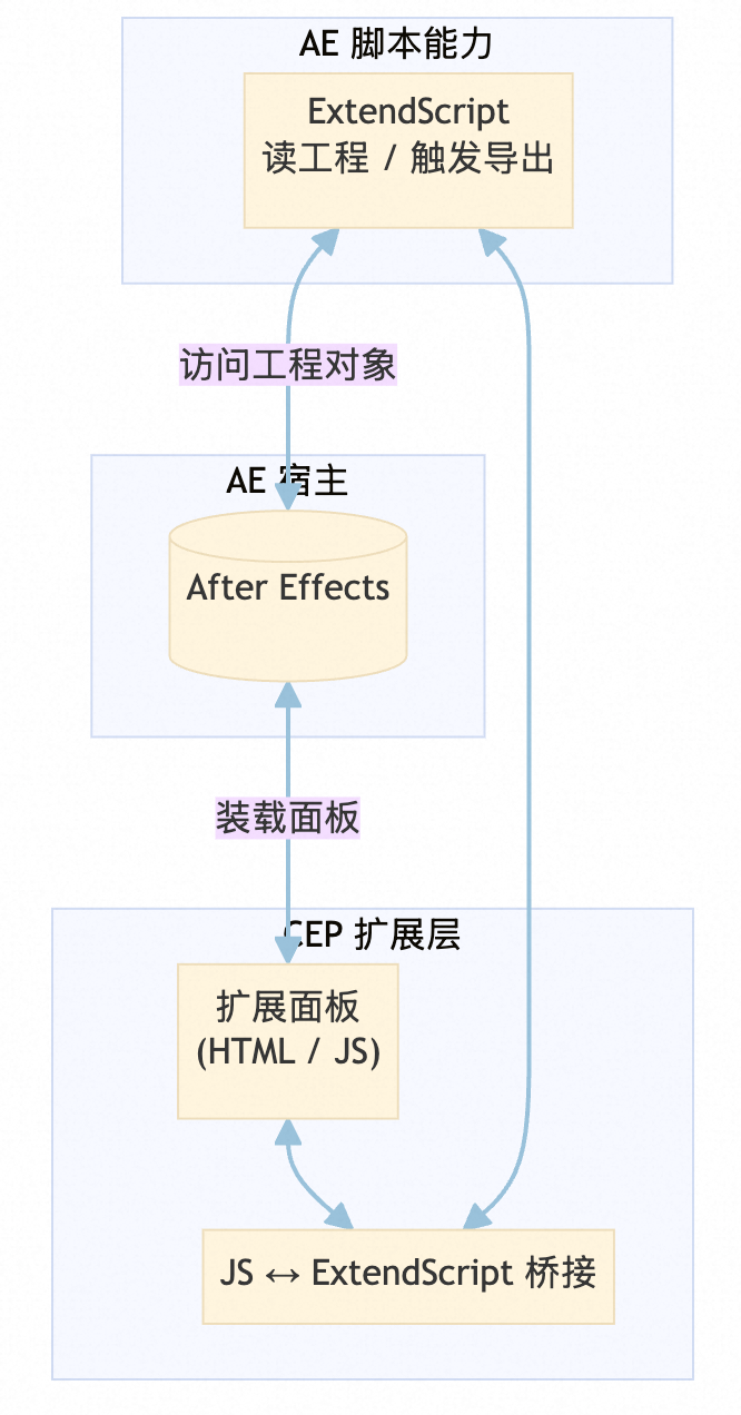 在研发AE(After Effects)插件的过程中,我们沉淀了插件在插件开发、插件热更新、插件日志、读取AE数据、插件构建、构建打包、版本推送方面的全流程能力。基于 CEP(Chromium Embedded Framework) 的 AE 扩展:面板是 Web 技术栈(React),与 AE 本体通过 ExtendScript / JSX 交换工程数据;对Bodymovin 进行了二次开发与交付。