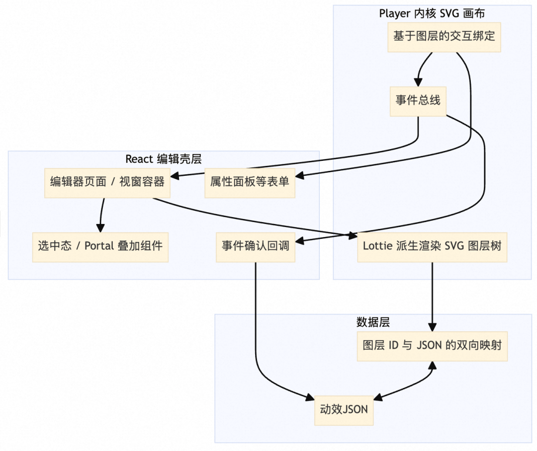 本项目的做法是:渲染仍走Lottie动效的 SVG 渲染,但在图层创建时注入「可编辑标识」与「交互事件」;React 页面负责容器、选中态、叠加 UI 与历史记录。 这样避免用一套完全自研的渲染器重做 Lottie,又能在图层的粒度上做选中与变换。