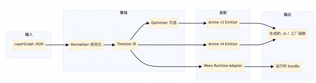 anime.timeline、部分选项名)与 v4(时间线、目标写法等变化)需同一套 IR 输出两套 Emitter -