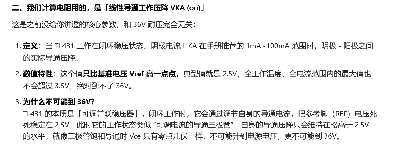 - 逻辑:分压后的VREF=2.5 V,刚好等于 TL431 内部基准,TL431 进入线性稳压区,VKA稳定在 2.5V 左右。
