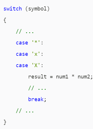 ##### 这意味着,如果用户输入 `*`、`x` 或 `X`,程序都会执行同一块代码(乘法运算)。