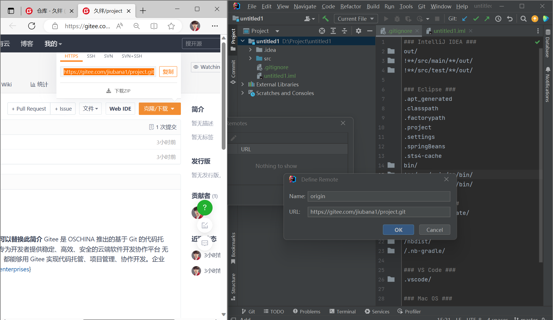 之后弹出一个登录 gitee 的窗口,输入自己在注册 gitee 的账号和令牌即可,然后点击 Log In,验证通过之后,Git Remotes 中便出现了远程项目的 Name 和 URL,最后点击 OK,这样就正式连接远程仓库项目了。