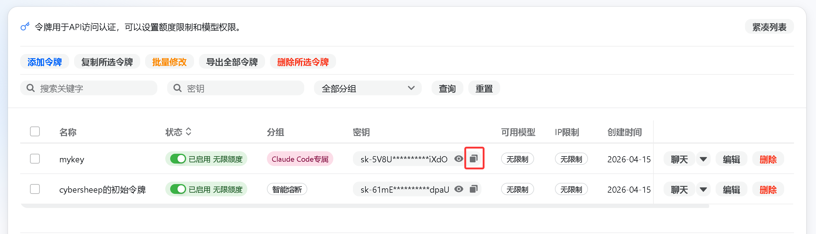找到刚刚创建的令牌,复制它的密钥,稍后会用到