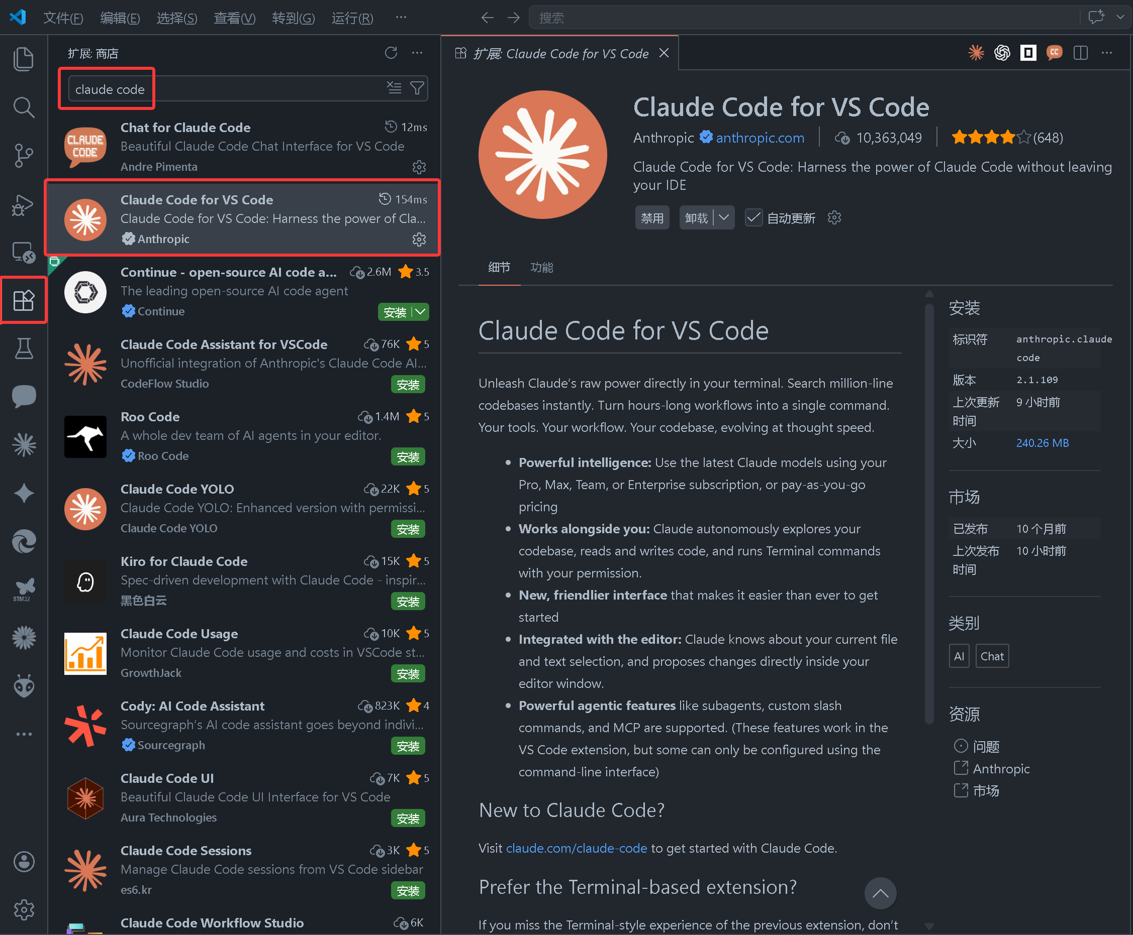 在VS Code的扩展商店,搜索claude code,安装Anthropic官方的claude code插件