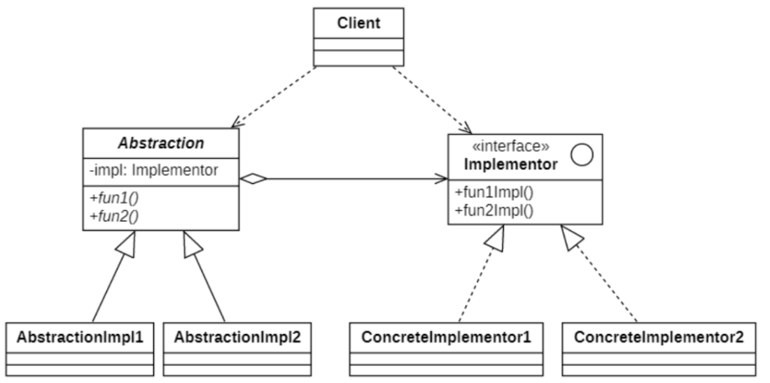 - AbstractionImpl(抽象类扩充) :扩充由Abstraction定义的接口,通常情况下它不再是抽象类 而是具体类,它实现了在Abstraction中声明的抽象业务方法,在AbstractionImpl中可以调用在 Implementor中定义的业务方法。