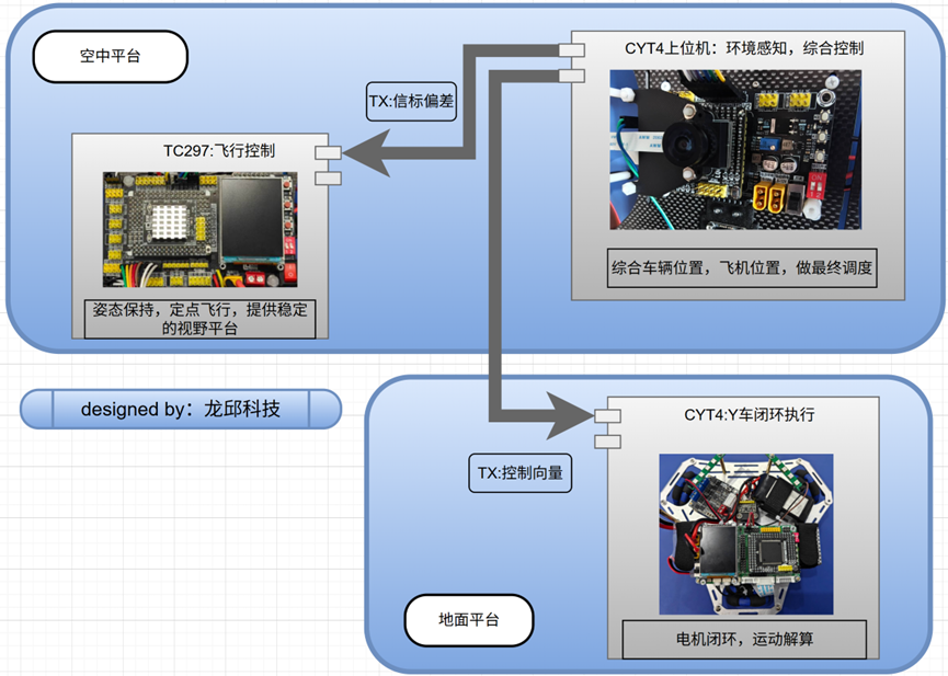 - 飞机端上位机 (CYT系列):负责"看"和"算"。处理摄像头图像,识别信标和Y车,然后分别把控制信息发给飞控和Y车。
