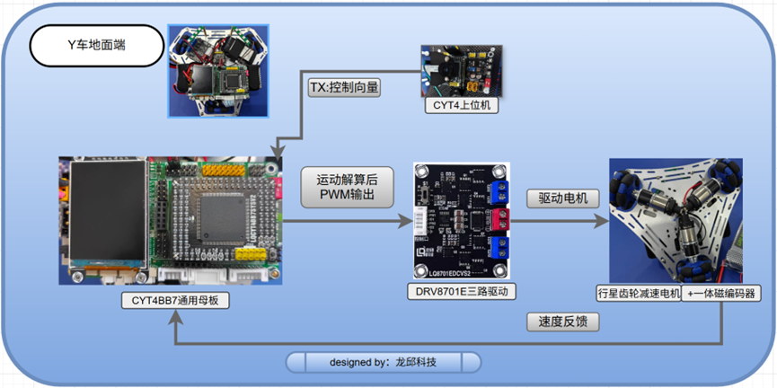 当地面 Y 车拿到目标误差以后,剩下的事情就不再是"视觉题",而是"控制题"。它需要把误差转换成全向底盘的运动指令,再通过电机闭环把动作真正做出来。只要方向正确、速度合理、闭环稳定,压灯就是水到渠成的结果。
