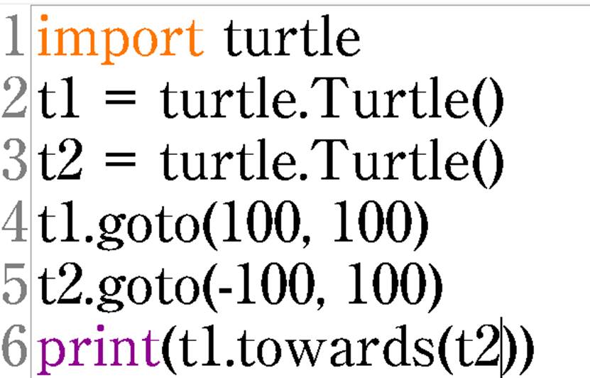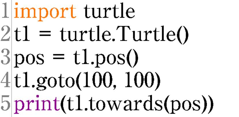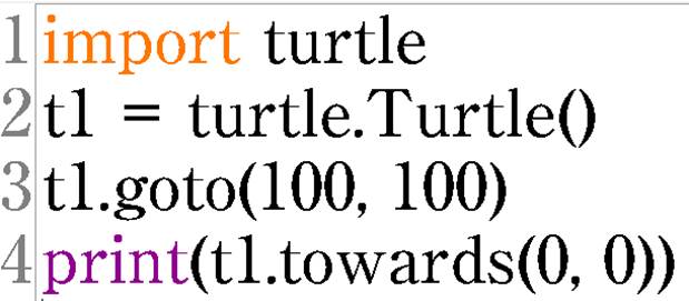 turtle.towards(other_turtle)中的other_turtle表示另外一支海龟,此时该函数返回的是两只海龟位置的连线与0°方向射线的夹角,代码如图4所示。