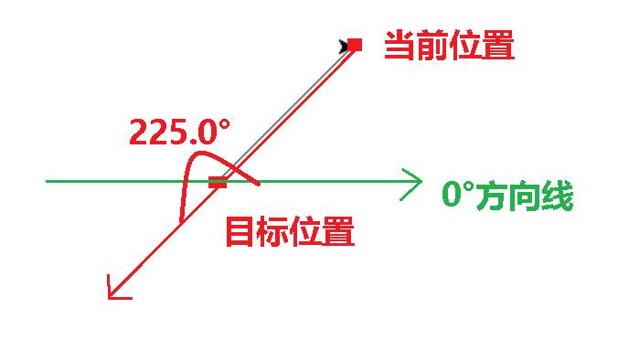 其中,第3行代码将海龟t1移动到(100, 100),第4行代码打印从海龟当前位置(100, 100)作为起点,指向目标点(0, 0)的射线,与海龟坐标系中 0° 方向射线之间的夹角,也就是225.0。原理如图2所示。
