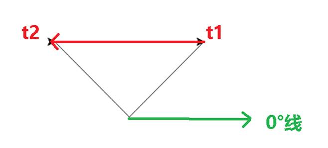 其中,第2和第3行代码分别生成t1和t2两只海龟。第4行代码将t1移动到(100, 100)处,第5行代码将t2移动到(-100, 100)处。此时,打印出的角度是180.0°。原理如图5所示。