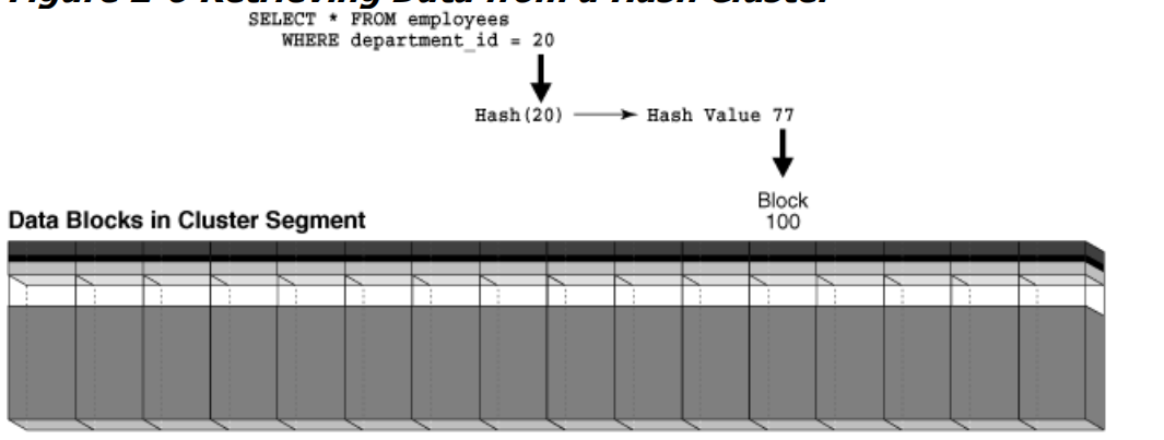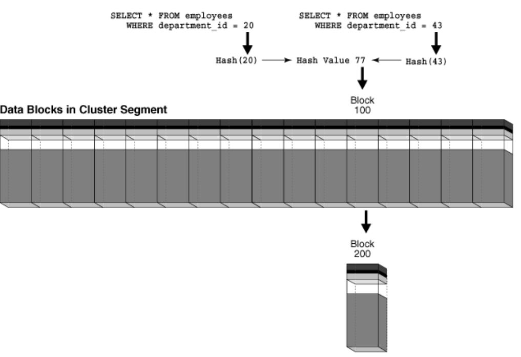 数据库使用内部生成的哈希值来定位包含请求的部门的雇员行所在的数据块。
