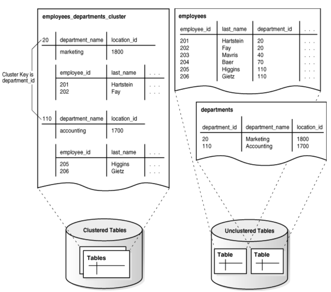 当表被聚簇时,单个数据块可以包含多个表中的行。例如,一个块可以同时存储来自 employees 表和 departments 表的行,而不只是单个表中的行。