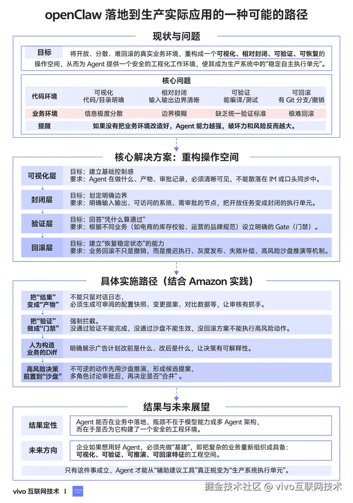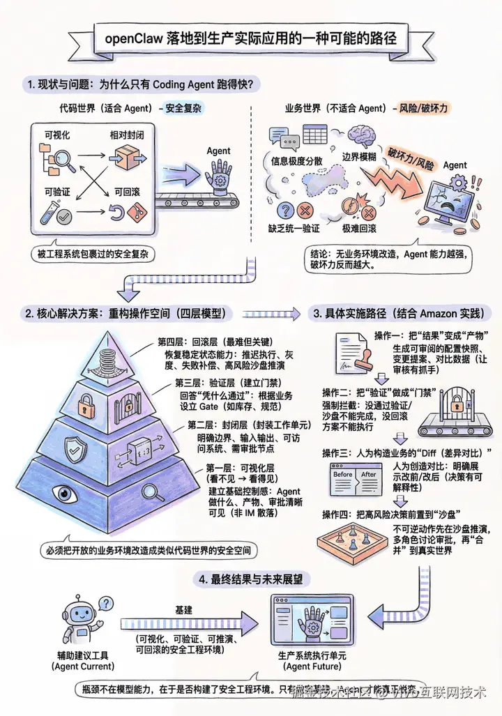 本文从 Coding Agent 为什么能率先跑通谈起,分析 OpenClaw 若要进入真实生产场景还缺哪些关键能力。核心判断是,要让 Agent 在业务世界稳定落地,必须把开放、分散、难回滚的执行环境,重构成一个可视化、相对封闭、可验证、可恢复的操作空间。