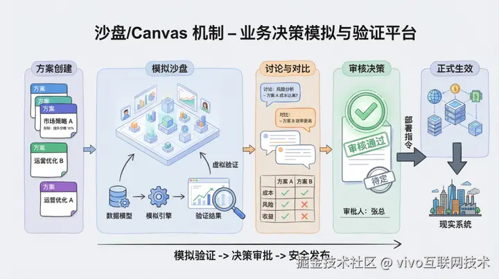 所以他们采取的是:先把问题、方案、预期影响、风险和资源消耗放进一个可视化沙盘里,形成一个可讨论、可审核、可比较的提案,再决定要不要把它推进到真实执行。