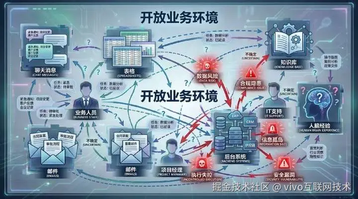 业务信息散落在聊天、表格、邮件、后台系统、知识库和人脑经验里;任务边界经常不清楚,执行到一半就变形;验证标准不统一,很多时候只能说"先做了再看";更关键的是,很多业务动作一旦真的执行出去,根本没有代码世界那种轻松回滚的条件。