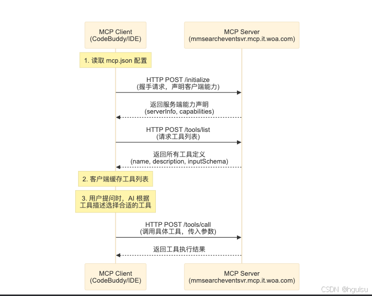 当 IDE 启动或加载 MCP 配置时,客户端向你配置的 URL 发送一个 initialize 请求: