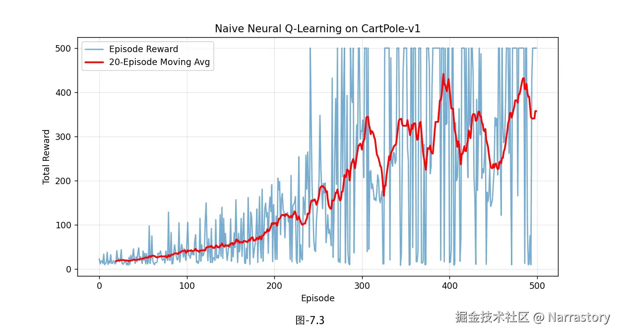 从图7.3中我们可以明显看到,虽然平均奖励整体呈上升趋势(说明智能体的确在进步),但单回合奖励的波动非常大------有时能达到满分的500(CartPole-v1的默认上限),但紧接着就暴跌到几十甚至更低,过一段时间又慢慢爬回去。这种"刚学会又忘记"的现象,正是朴素Q学习在使用神经网络近似时暴露出的经典问题。因此,虽然朴素神经网络Q学习在理论上正确,但在实践中几乎无法稳定地解决稍微复杂一点的任务。