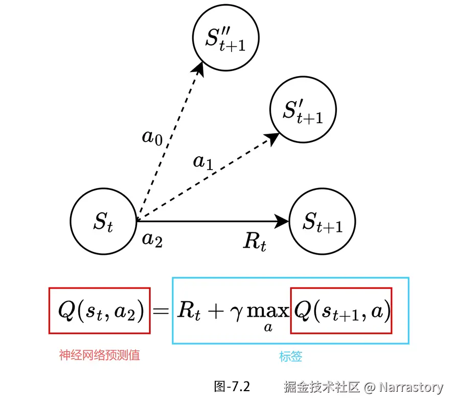 这里的直觉是:我们把 <math xmlns="http://www.w3.org/1998/Math/MathML"> R t + γ max a ′ Q ( S t + 1 , a ′ ) R_t + \gamma \max_{a'} Q(S_{t+1}, a') </math>Rt+γmaxa′Q(St+1,a′) 看作一个目标值(TD Target) 。它代表"基于当前对下一步的最佳估计,我在状态 <math xmlns="http://www.w3.org/1998/Math/MathML"> S t S_t </math>St 执行动作 <math xmlns="http://www.w3.org/1998/Math/MathML"> A t A_t </math>At 应该能得到多少回报"。如果这个目标值比当前的 <math xmlns="http://www.w3.org/1998/Math/MathML"> Q ( S t , A t ) Q(S_t, A_t) </math>Q(St,At) 估计要高,我们就把Q值往上调一点;反之则往下调。