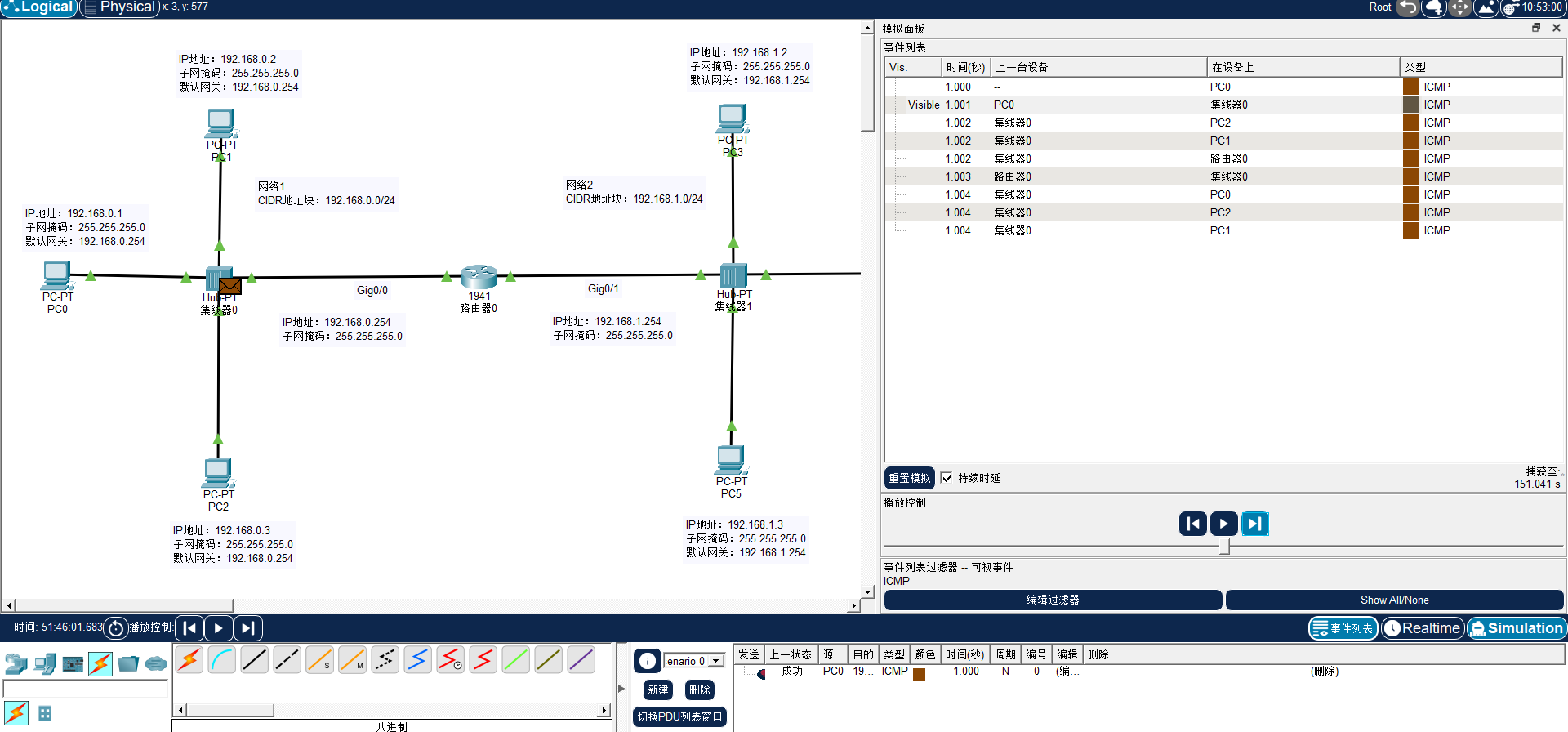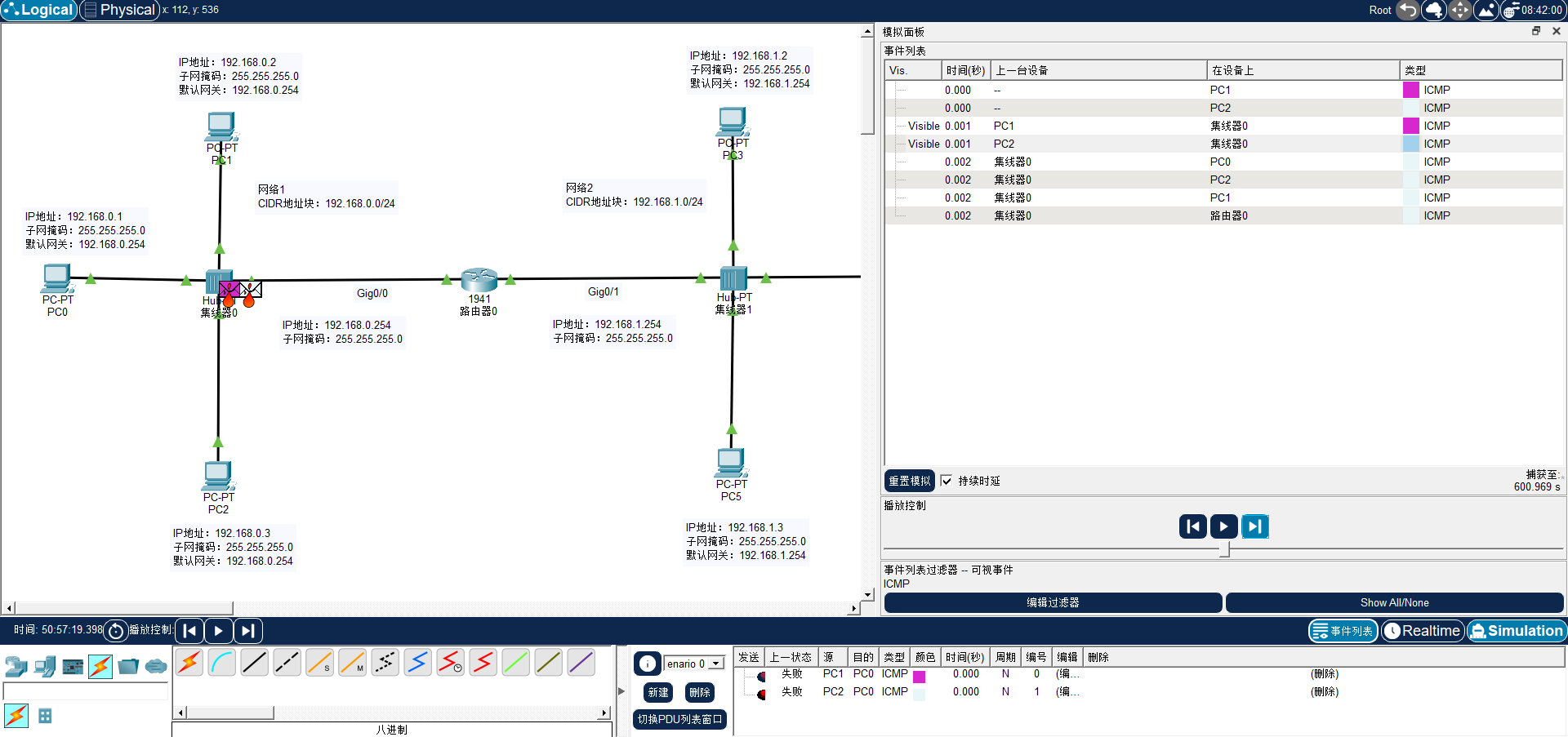 单击播放控制栏的"单步执行"按钮。PC0 将封装好的单播帧发送至物理介质,抵达集线器 Hub0。