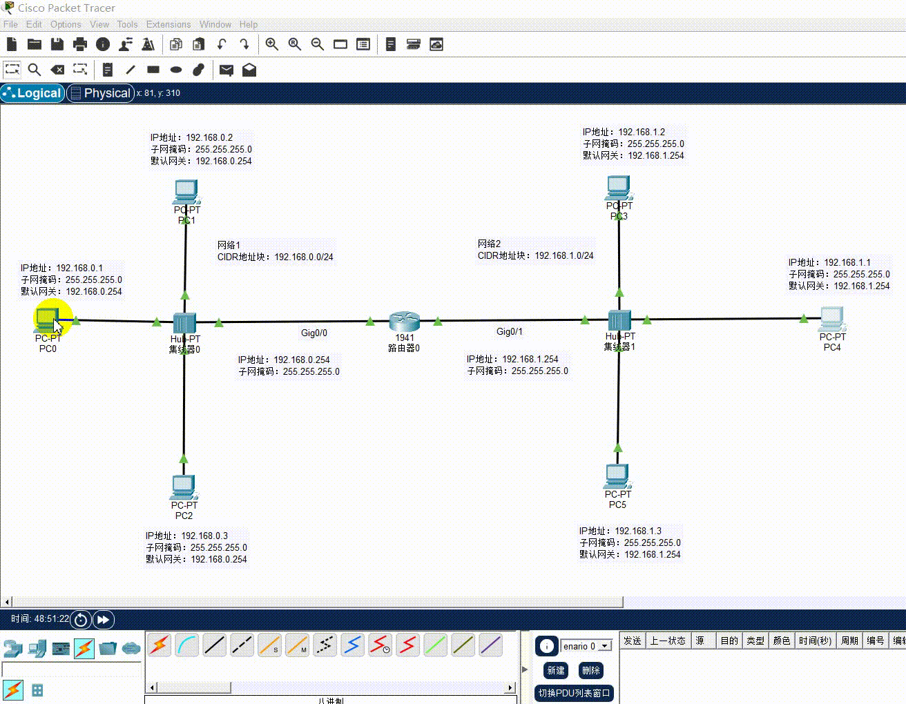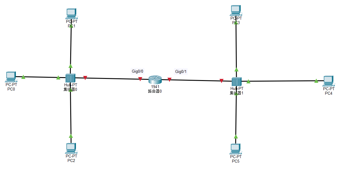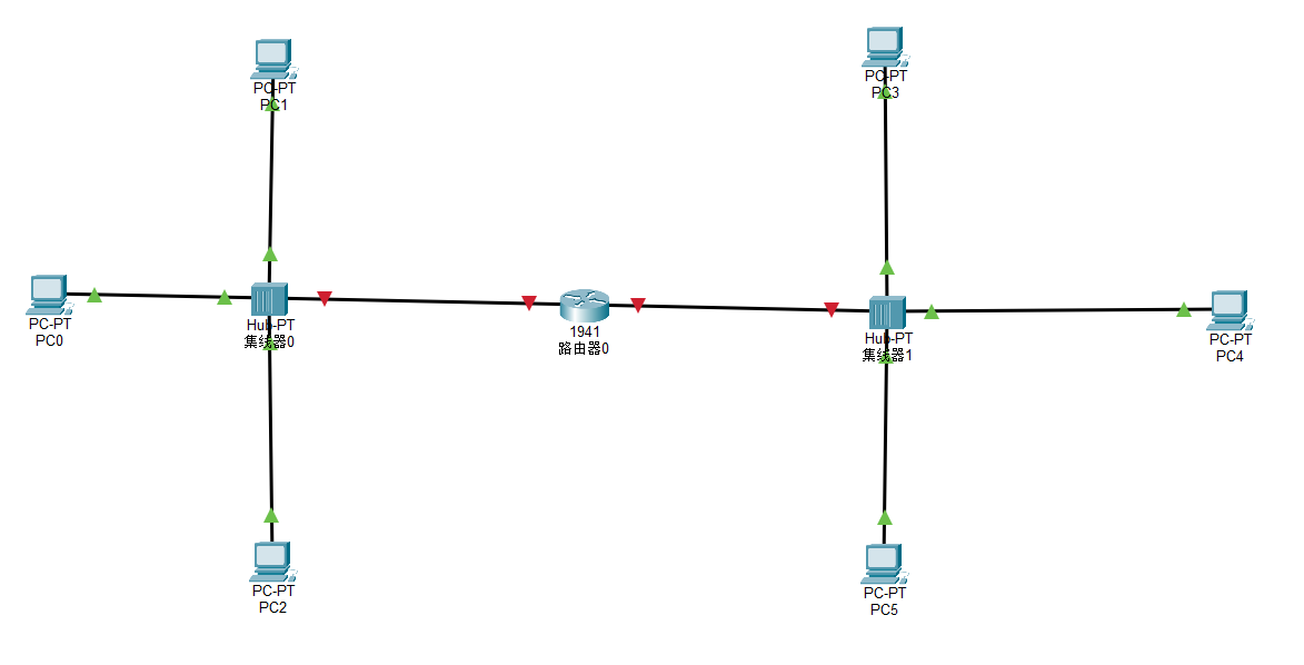 在构建网络拓扑阶段,主要任务是在 Packet Tracer 的逻辑工作区中搭建出由两个独立局域网组成的共享式以太网环境。首先需要添加核心路由设备,从网络设备库中选择型号为1941的路由器放置于工作区中央,并命名为 Router0。随后,围绕路由器构建共享式物理环境,选取两个基础型号为 Hub-PT 的集线器,分别置于路由器的左右两侧,依次命名为集线器0与集线器1。在终端设备层面,选用通用的 PC-PT 型号,在左侧集线器周围配置三台计算机(PC0、PC1、PC2),并在右侧集线器周围作对等配置(PC3、PC4、PC5)。最后进行物理线缆的连接,采用铜轴直通线将两侧的计算机分别汇聚连接至对应的集线器,再将两台集线器分别上联至中间的 Router0 路由器。需要注意的是,连接完成后集线器与计算机之间的链路指示灯将显示为绿色,代表物理层已建立连接;而路由器两侧的链路指示灯默认呈红色,这是由于路由器的物理接口在初始状态下处于管理性关闭(Shutdown)模式,必须在后续步骤中通过配置命令手动激活。