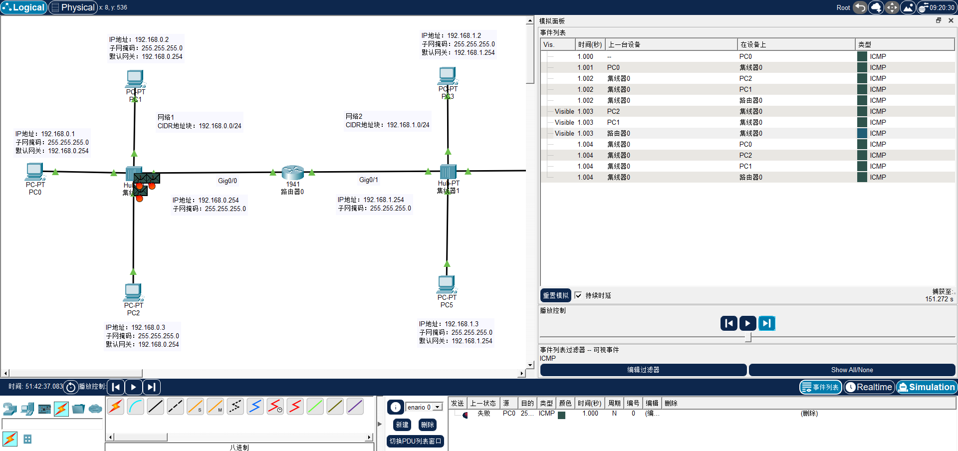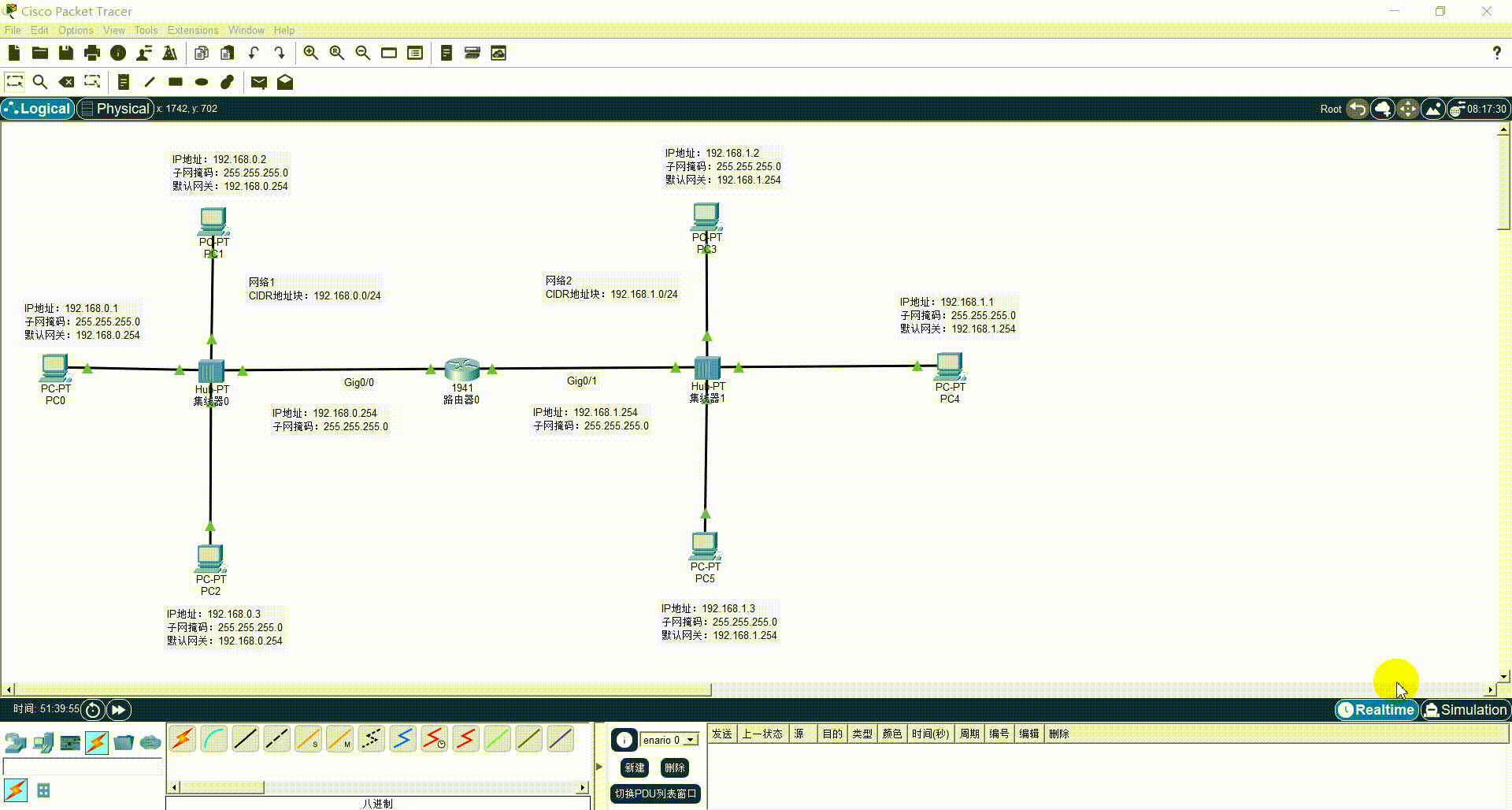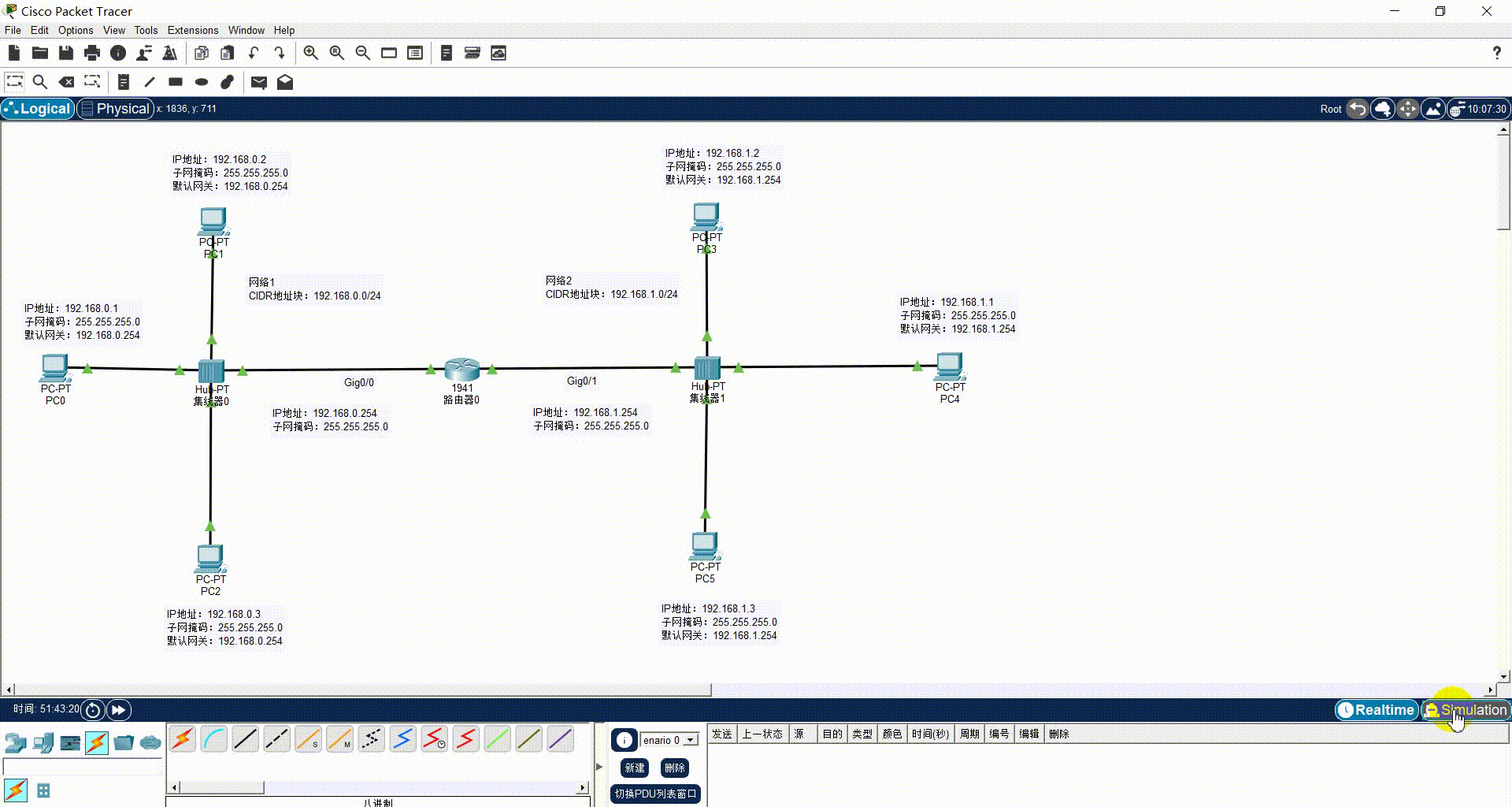在完成了实时的环境预热后,为深层剖析网络设备的隔离特性,需将 Packet Tracer 切换至"Simulation(模拟)"工作模式。从现有的拓扑结构与 IP 规划可知,路由器 Router0 的 Gig0/0 和 Gig0/1 接口分别下联了一个基于集线器的共享式以太网。理论上,路由器的每一个接口都划定了一个独立的碰撞域与广播域。本阶段将通过单步模拟捕获数据帧的流转过程,对这一核心理论进行可视化验证。