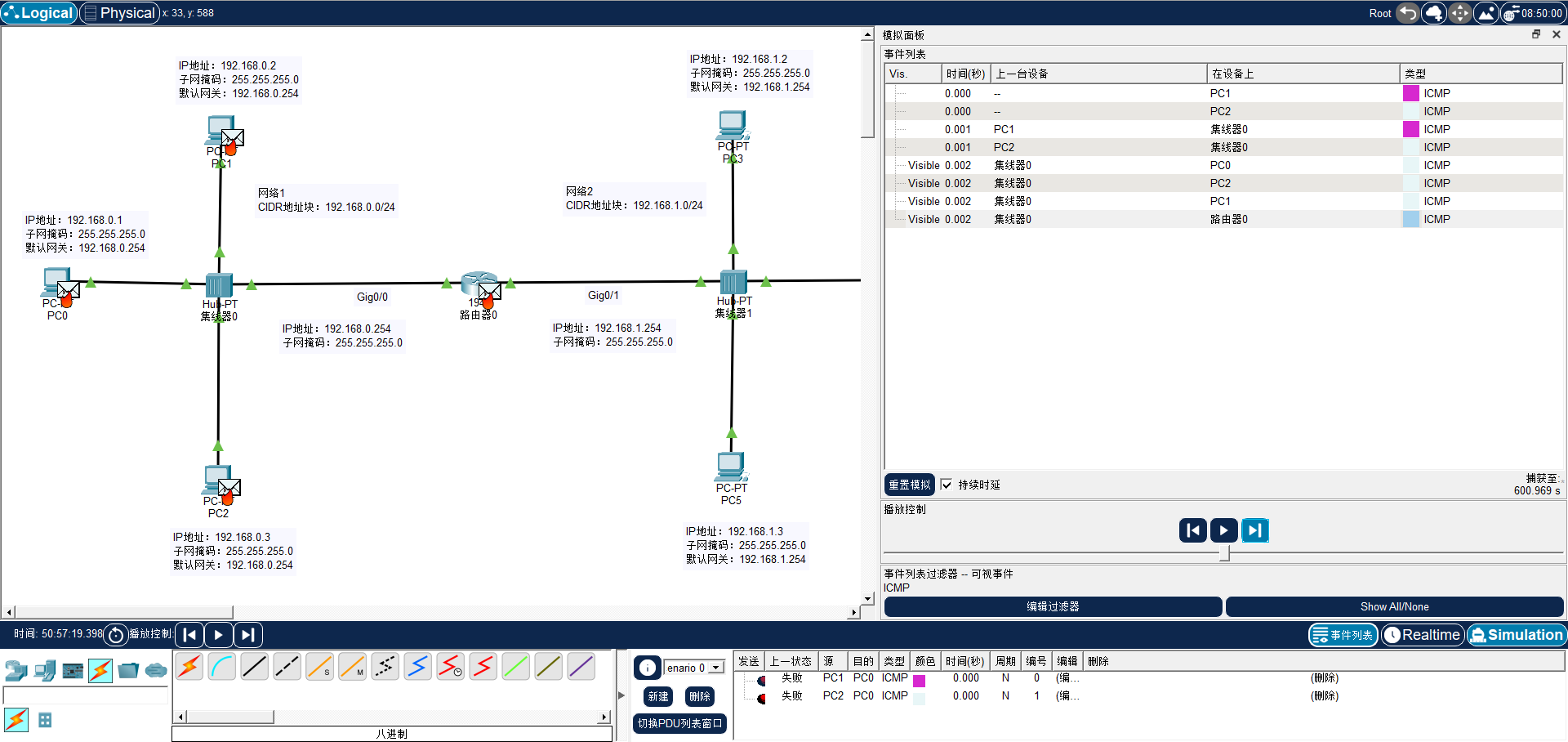 最后单击"单步执行"按钮。碰撞产生后,数据帧结构被破坏。集线器 Hub0 再次执行泛洪机制,将代表碰撞碎片的"火苗"向所有端口广播。由于报文在物理层已被破坏,PC0 最终未能接收到任何合法的 ICMP 应答,右下角 PDU 状态栏直接将此次通信的最终结果标记为"Failed(失败)"。单步模拟流程到此终止。