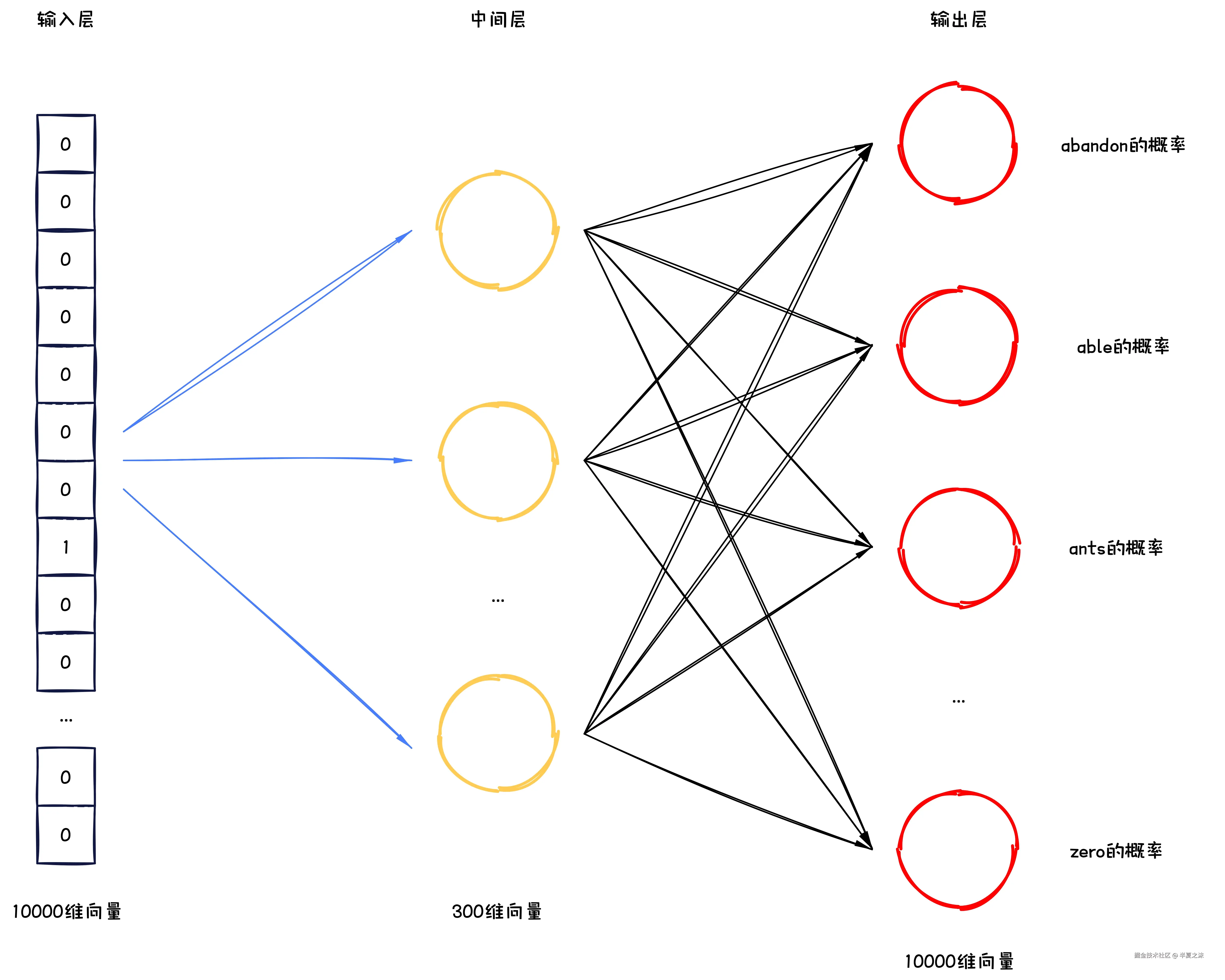 输入层 是10000 维的独热编码 向量,先与一个 <math xmlns="http://www.w3.org/1998/Math/MathML"> W i n ⊆ R 10000 × 300 W_{in}\subseteq \mathbb{R}^{10000 \times 300} </math>Win⊆R10000×300的权重矩阵 相乘,做第一次线性变换 得到一个300 维的中间层 向量,然后300 维的中间层向量再与一个 <math xmlns="http://www.w3.org/1998/Math/MathML"> W o u t ⊆ R 300 × 10000 W_{out}\subseteq \mathbb{R}^{300 \times 10000} </math>Wout⊆R300×10000 的权重矩阵 相乘,做第二次线性变化 得到10000 个输出得分,这些输出得分 表示输入是"ants "的情况下,输出是词表中对应位置 的词的得分,得分越高 ,说明神经网络越认为应该输出这个词。