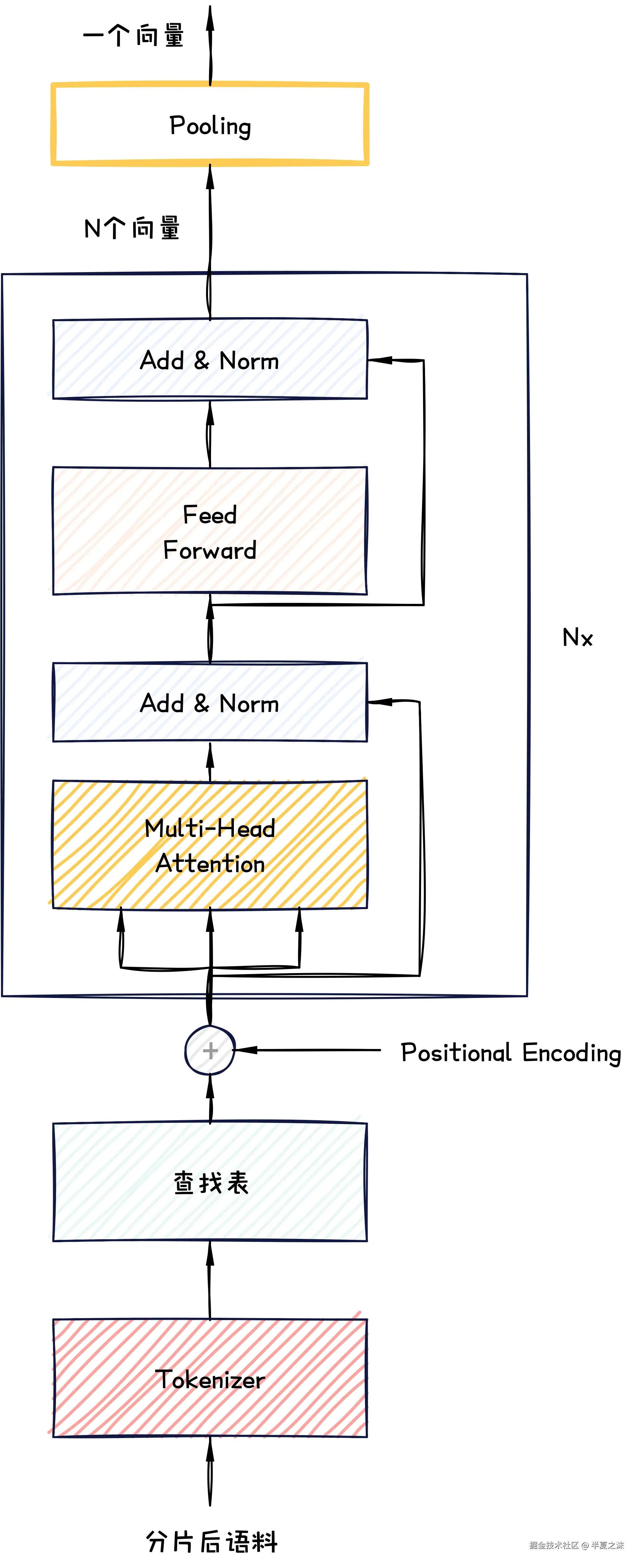 Transformer 编码器结构和大语言模型 里的Encoder 保持一致,由多头自注意力机制层 ,残差连接层 和前馈层 组成,经过位置编码后的100 个1024 维向量会在Encoder 中进行Nx 轮的信息聚合,信息聚合 后会得到新的100 个1024 维向量,此时这100 个1024 维向量中的任何一个向量,都可以认为其包含了分片后语料 中的完整信息 ,这是由Transformer 中的Encoder 的自注意力机制特性决定的,也不做展开。